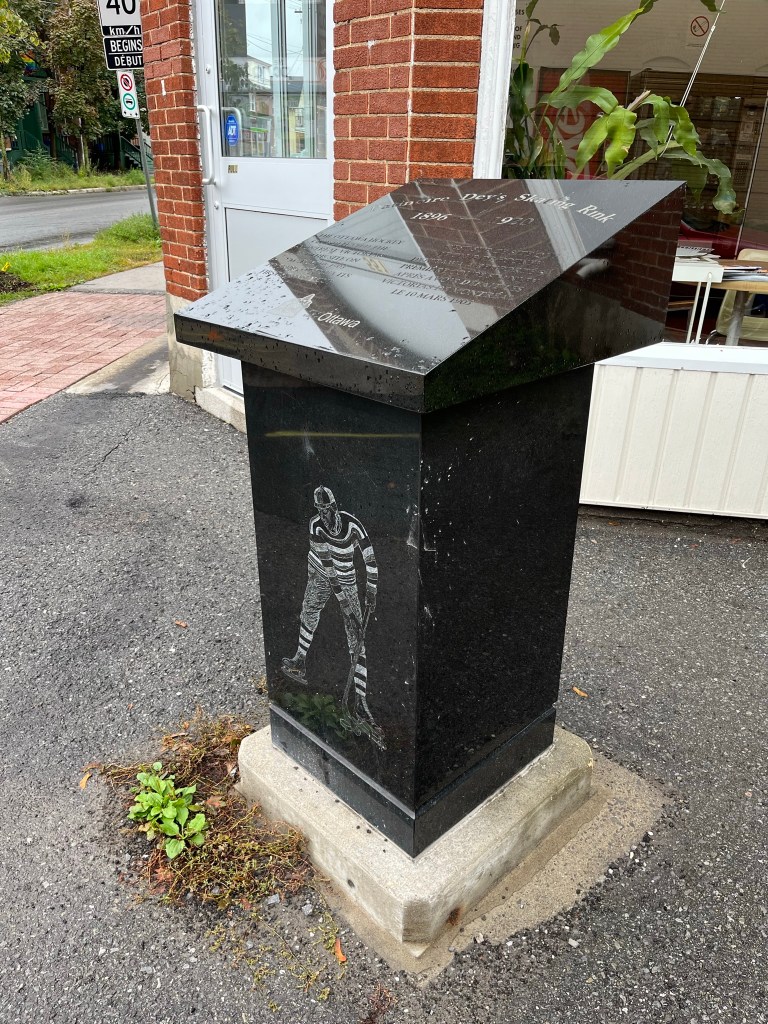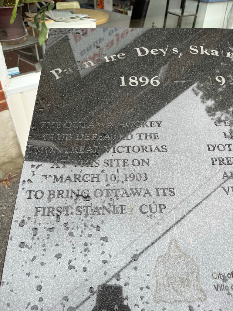 Before this memorial was installed, there was a plaque placed at this very site that has been destroyed. It was installed on the corner of Gladstone (Ann St.) and Bay, Thursday, March 20th, 1997, by Ottawa Mayor Jacquelin Holzman and Dawson City Mayor Glen Everitt (as that coming Sunday, the Dawson City Nuggets were going to play the Ottawa Senators Alumni at the Corel Centre). (The Ottawa Citizen, March 1997) This 1997 plaque was destroyed by vandals ten years later and replaced with a memorial in 2008. (The Ottawa Citizen, March 2014) The community group, The Dey’s Rink Memorial Committee, chaired by Mr. Kitchen, coordinated donations for the replacement. (The Ottawa Citizen, November 2008) Witnessing the 2008 unveiling of the replacement memorial was by the Memorial Committee, Mayor Larry O’Brien, and Councilor Diane Holmes. (The Ottawa Citizen, November 2008)